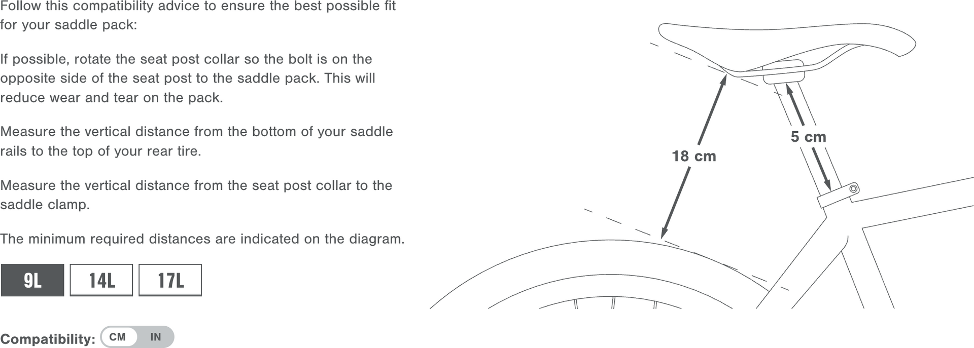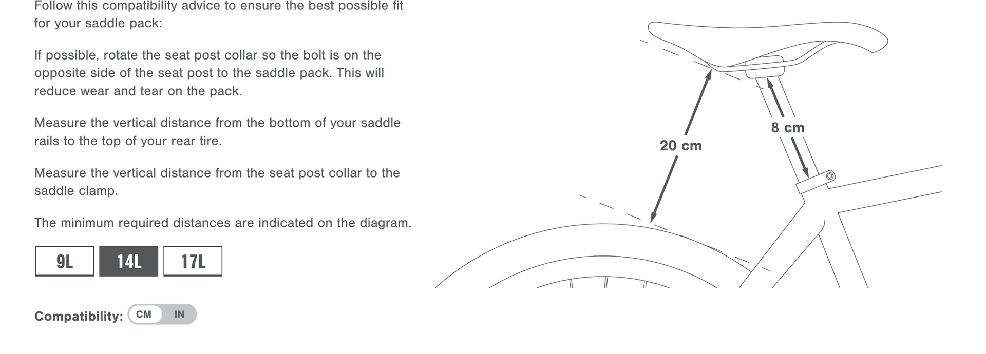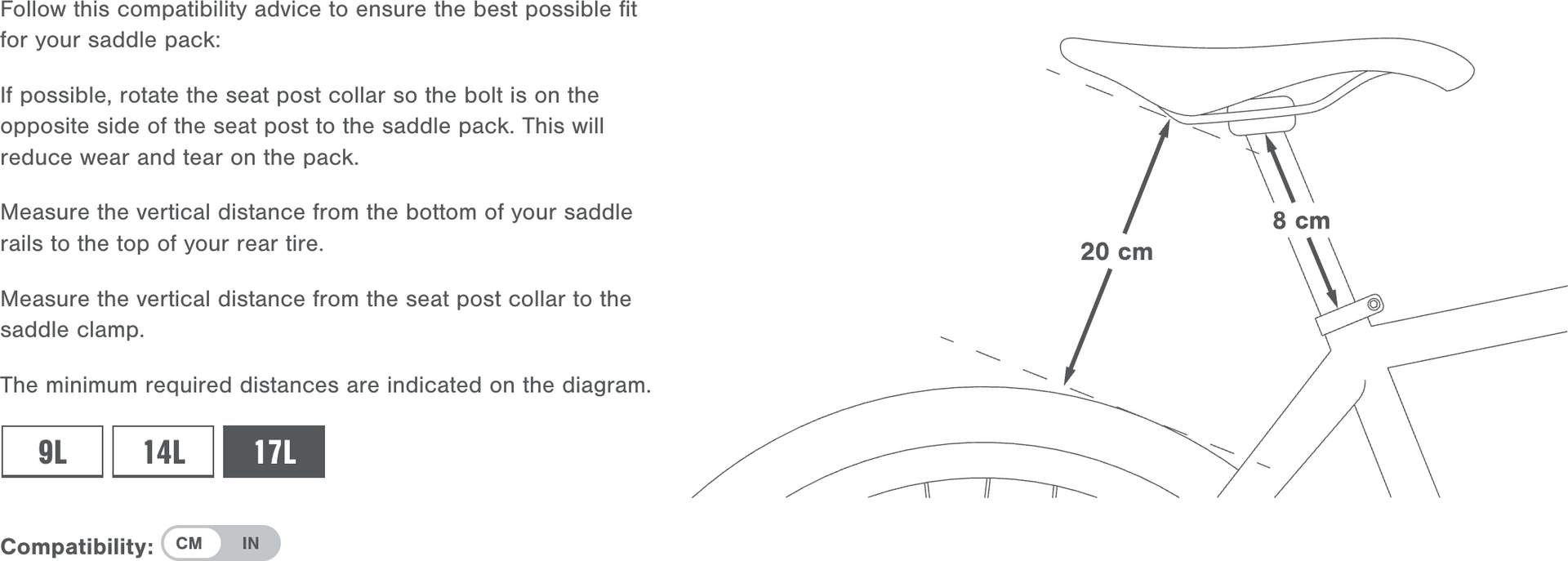 Peräporkkanaa hankittaessa on huomioitava, että fillarissa pitää olla riittävästi tilaa satulan ja takarenkaan välissä, sekä riittävästi esillä olevaa satulatolppaa. Expedition satulalaukussa mittavaatimukset ovat (mitattuna atulan kiskoista viistosti kohti takarengasta:
